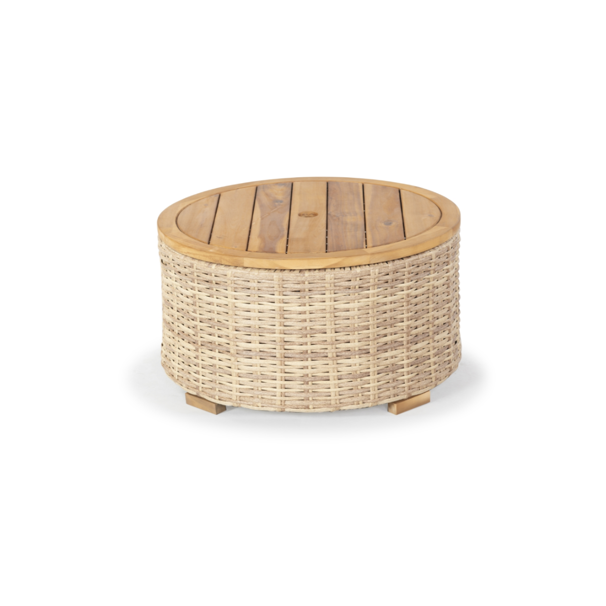 Transform your patio with our Beige Anguilla Wicker Coffee Table, which offers a chic and elegant update. This coffee table adds a touch of warmth and practicality to any outdoor space. Its all-weather wicker weave provides a sophisticated look, while the perfectly rounded tabletop, made from acacia wood, features a beautiful slatted design. The tabletop is removable, allowing for convenient storage of coasters, throw pillows, and other essentials. Supported by powder-coated legs, the coffee table serves as an elegant and functional centerpiece for your patio, terrace, or sunroom.