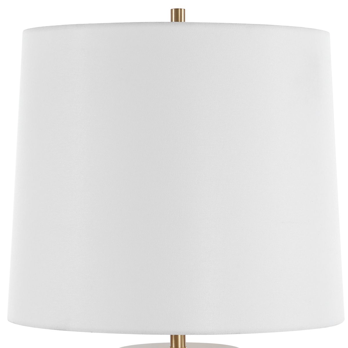 The Black Trentino Table Lamp features a striking frosted black glass base, accented by lightly antiqued brass-plated details. The tapered, round hardback shade is covered in crisp white linen fabric.