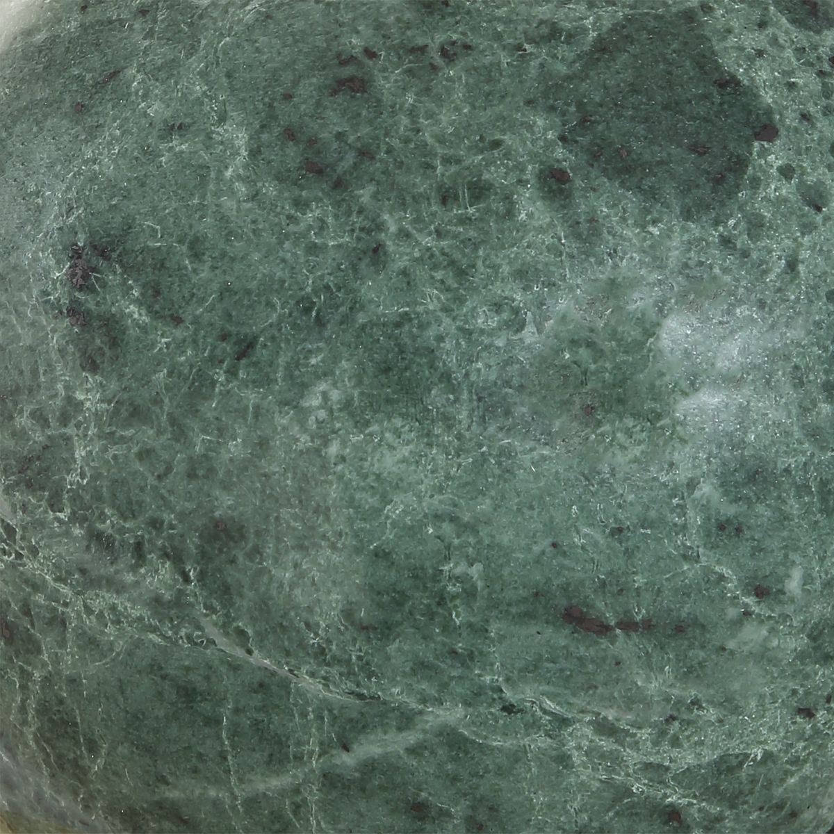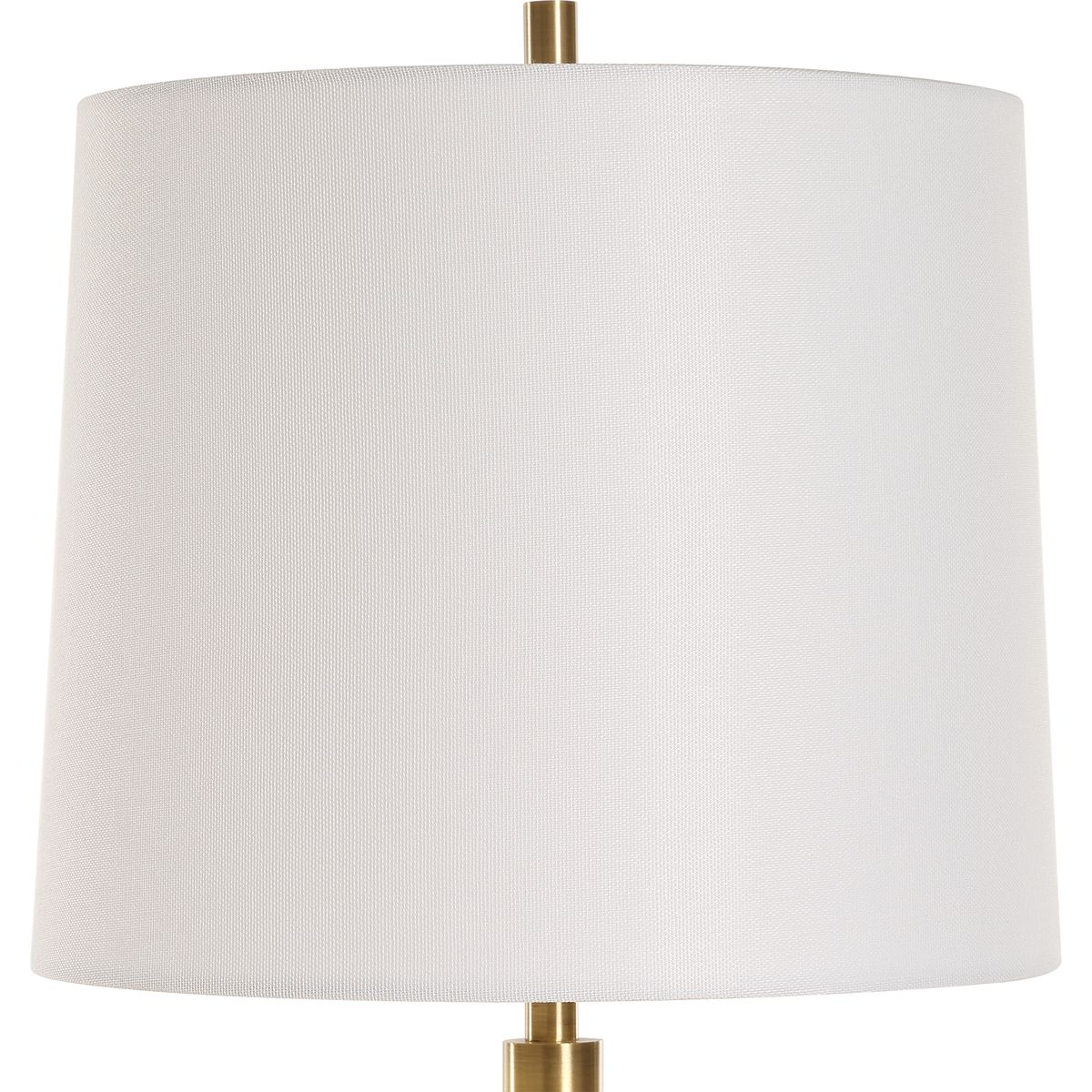 The Bledel Buffet Lamp showcases a sleek, sophisticated plated brushed brass column, elevated by a polished dark green marble orb. The slightly tapered, round hardback shade is adorned with a timeless white linen fabric.
