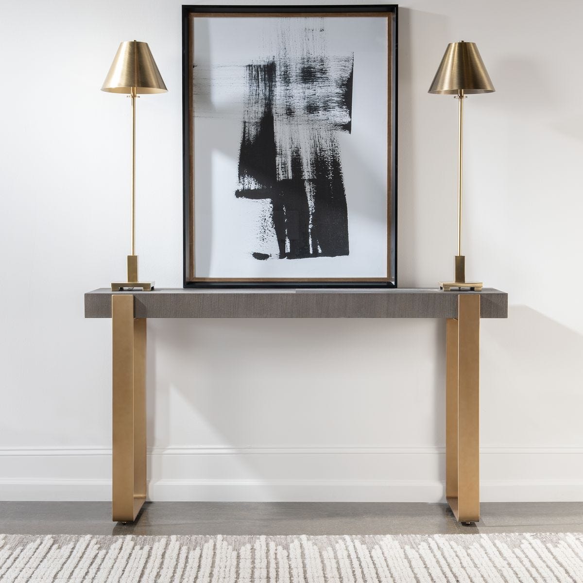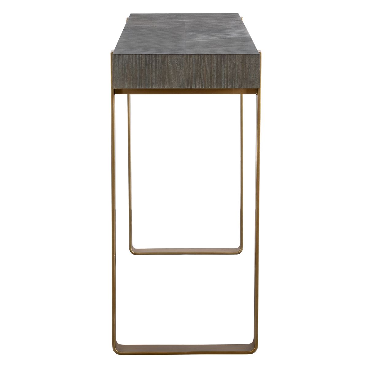 Contemporary in style, this Kea Console Table features a striking diamond ash veneer top finished in a dark walnut stain with light gray glazing. The iron strap legs have a warm brushed brass finish.