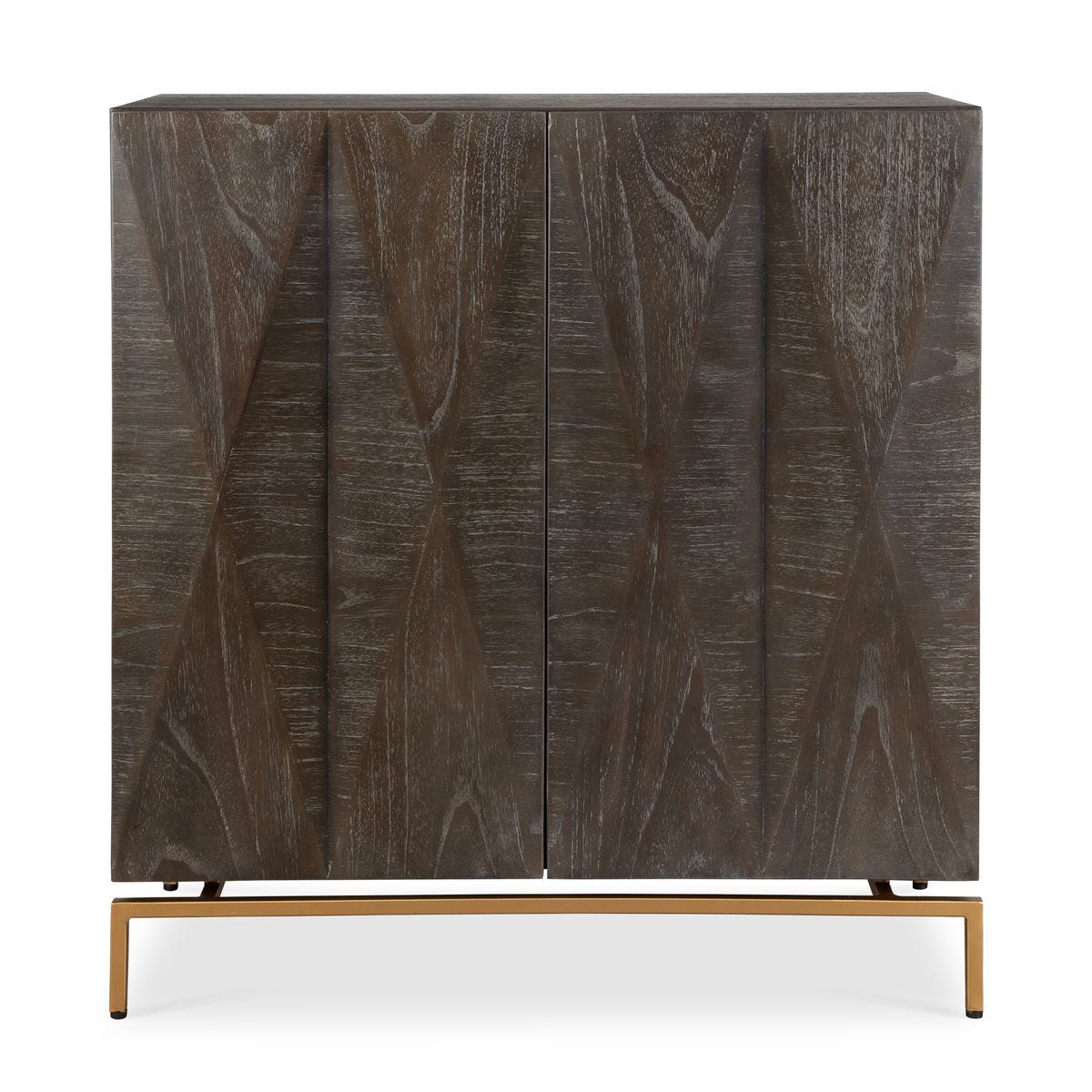 This Marico 2-Door Cabinet features geometric door fronts crafted from ebony cerused Mindi veneer. The rich wood tones are complemented by a sleek gold-plated base, adding contemporary flair to this piece.