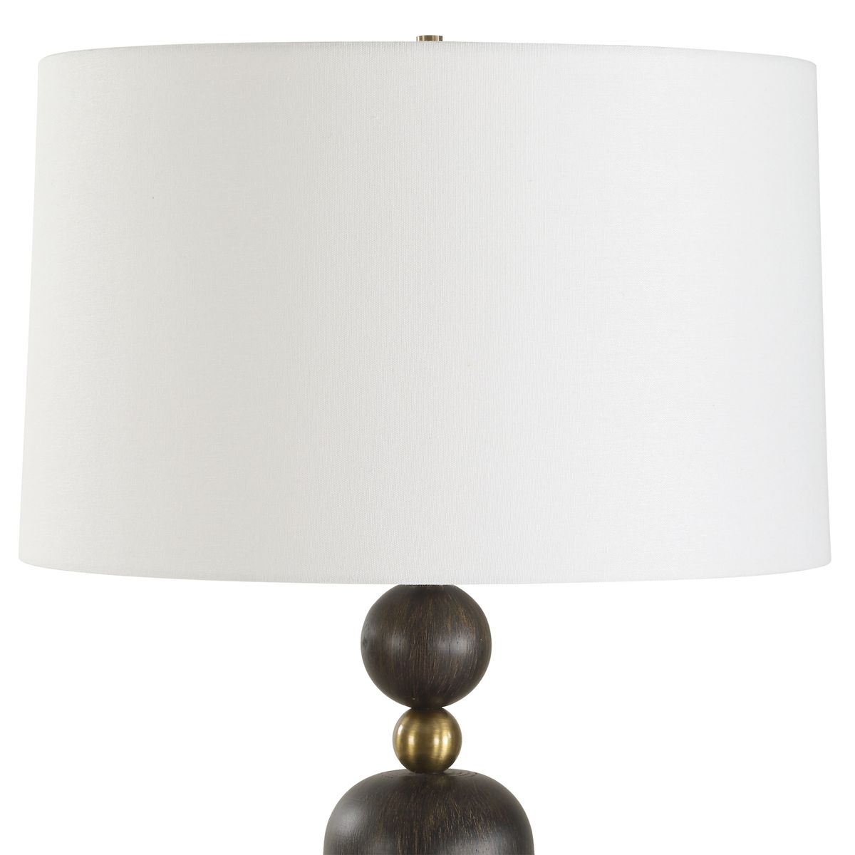 The McQuinn Table Lamp has a dark walnut-finished wooden cylindrical base accented by an antique brass-plated sphere for added elegance. The slightly tapered round shade is made of crisp white linen.