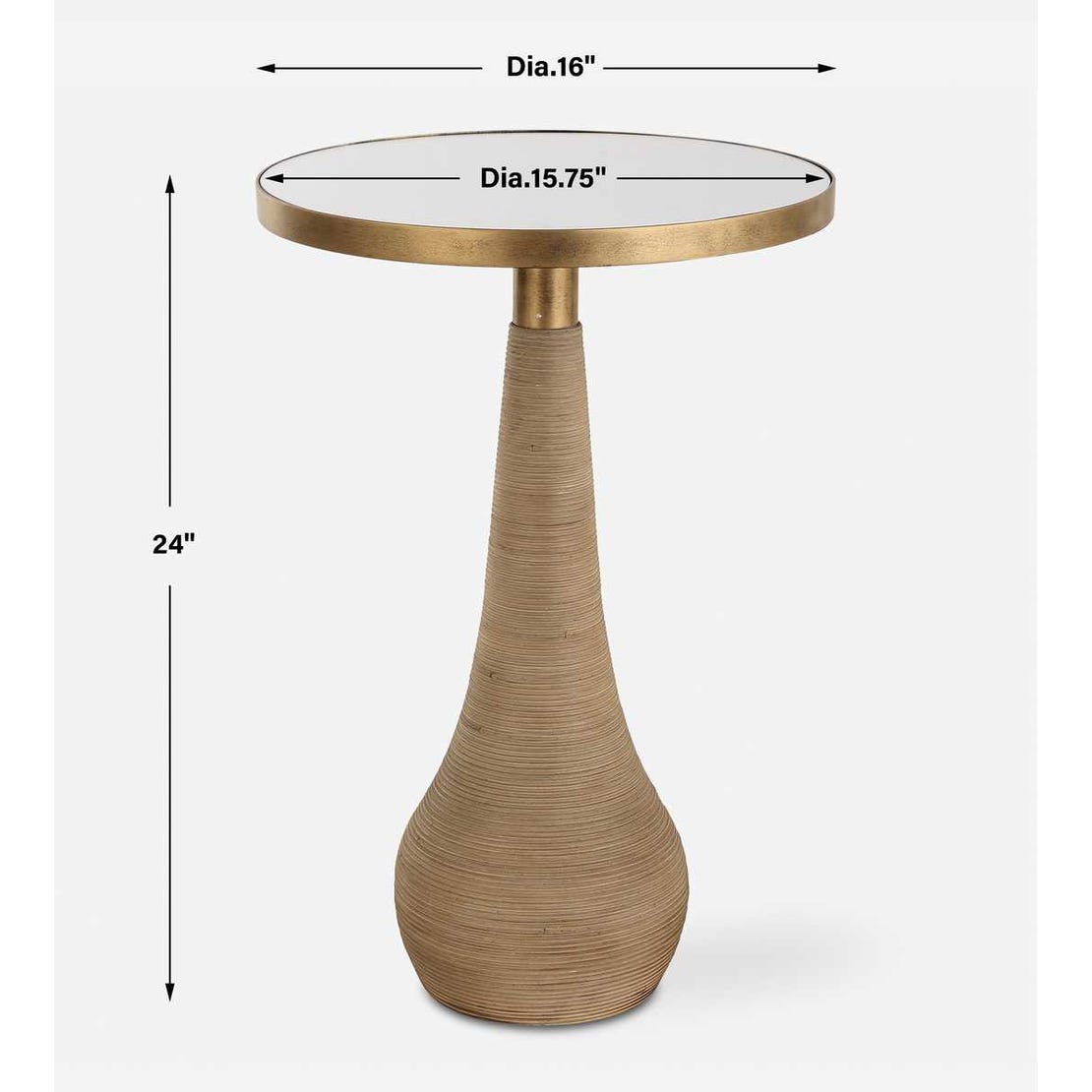 Elegant and luxurious, this Terra Accent Table is crafted from natural rattan and antique brass-finished iron. It features a glamorous mirror top, perfect for practical use.