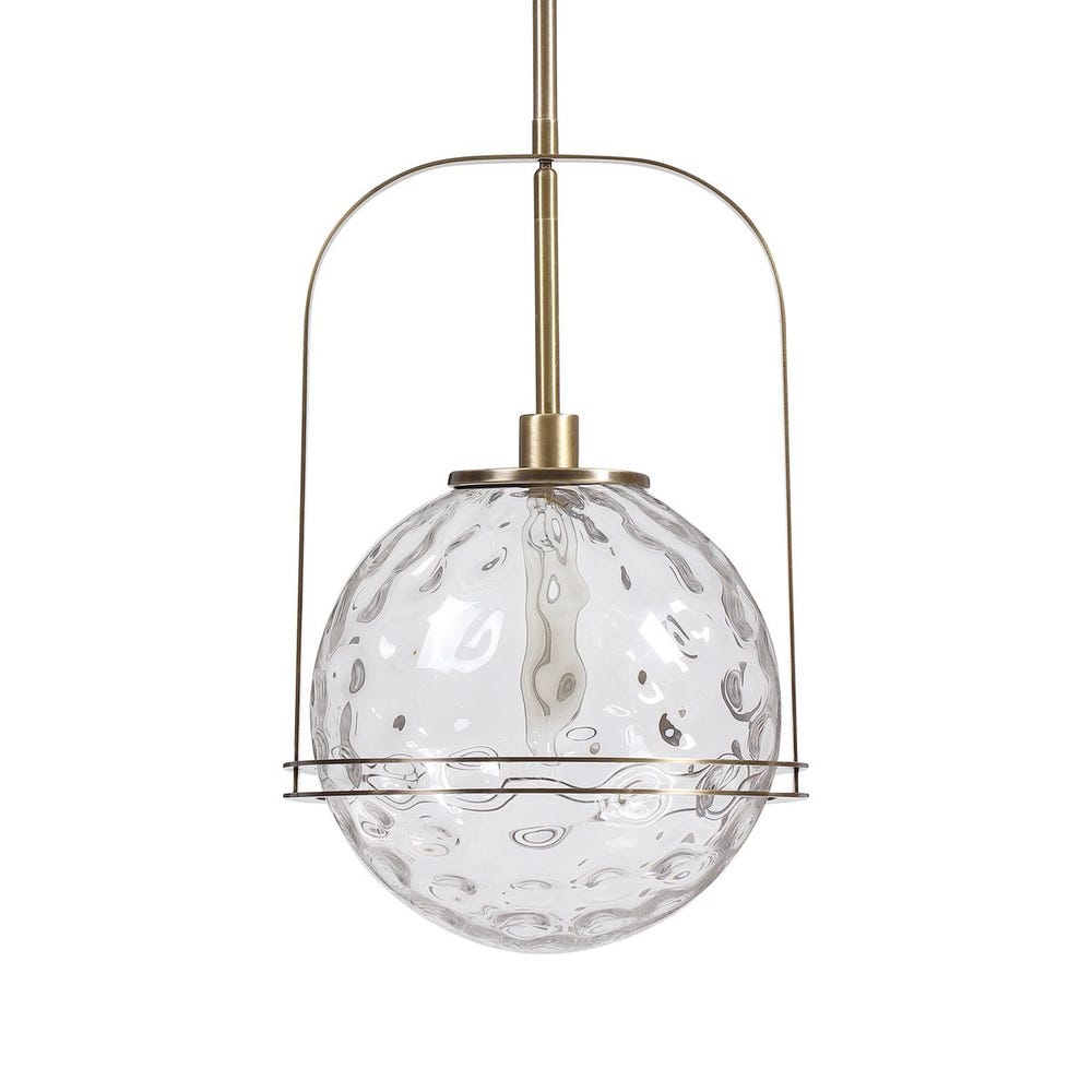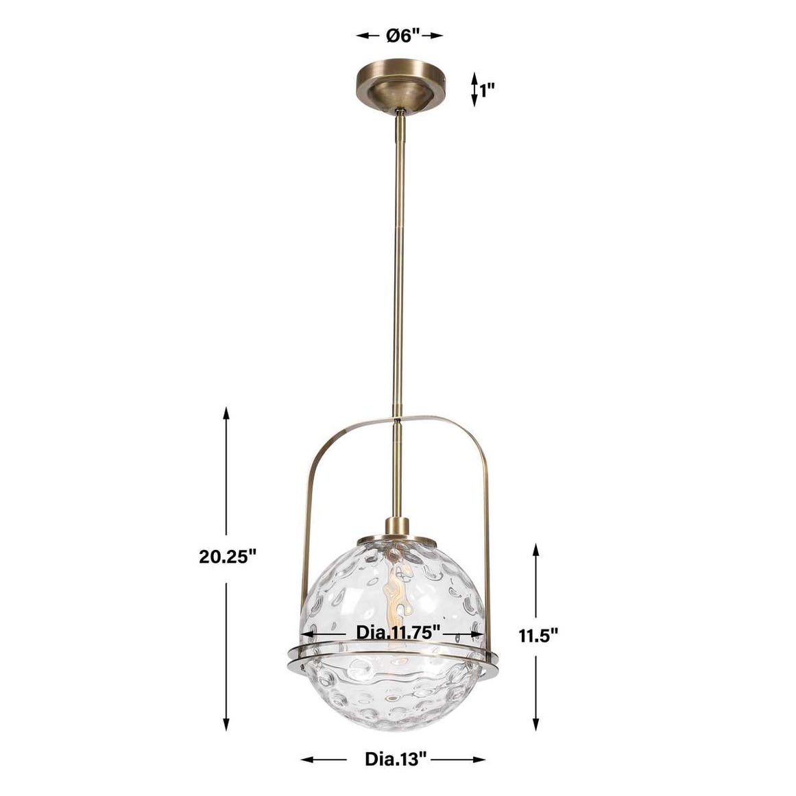 The Mimas 1-Light Pendant features soft, contemporary lines that complement its oversized, floating sphere made of clear, water-textured glass. The design is further enhanced by rich antique brass accents, reflecting modern aesthetics. It includes one 40-watt max Edison socket (bulb not included) and comes with 15 feet of wire, along with three 12-inch stems and one 6-inch stem, allowing for adjustable installation.