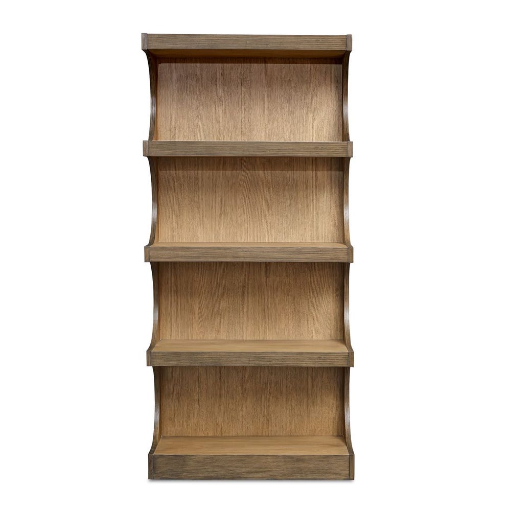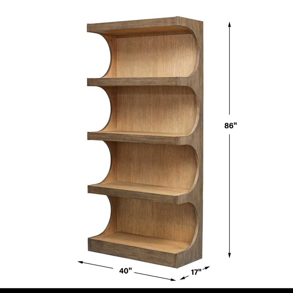 The Osrick Etagere beautifully blends modern elegance with delightful retro charm. Crafted from durable mindi solids and veneers, its warm, natural finish radiates timeless appeal, making it the perfect addition to any home dรฉcor.