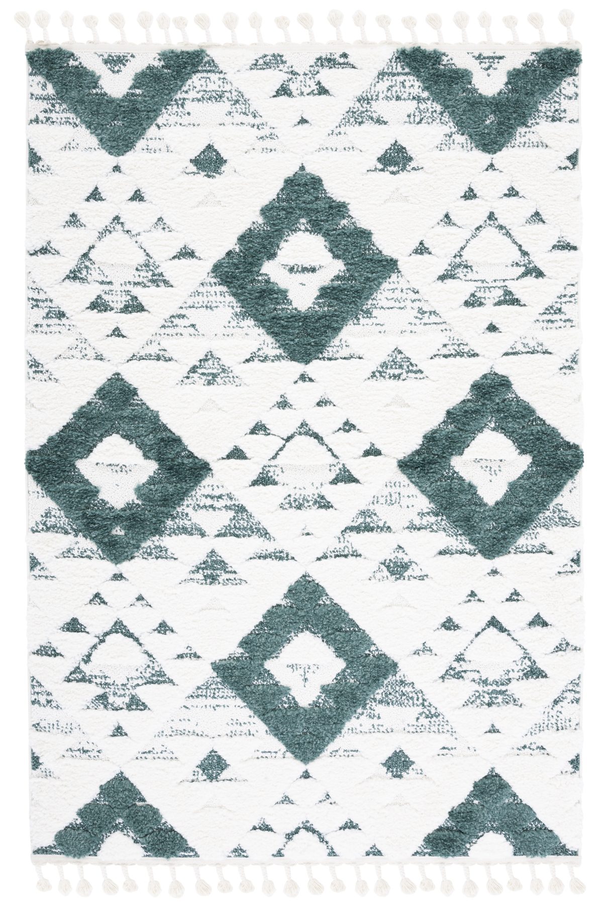 The Trendy Boho style shines through in the plush textures and appealing designs of the White and Green Moroccan Tassel Shag Rug. It features nomadic patterns crafted in a luxurious high-low pile, topped off with braided fringe at the ends. This rug is power-loomed from soft synthetic yarns, providing a comfortable feel underfoot.