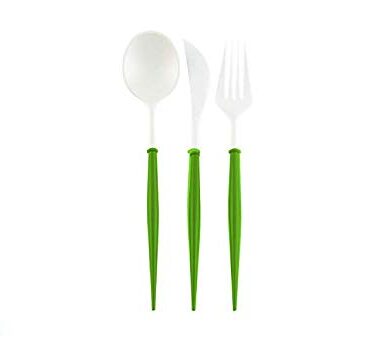 Bella White and Olive Flatware 24ct reusable plastic cutlery by Sophistiplate is gorgeous, sleek, and modern elevating any table, place setting, or event. Perfect for birthday parties, date nights, family gatherings, holidays, parties, BBQs, outdoor entertaining, and more. The White and Olive cutlery set is exquisite with the Lemon Drop tableware and napkins.