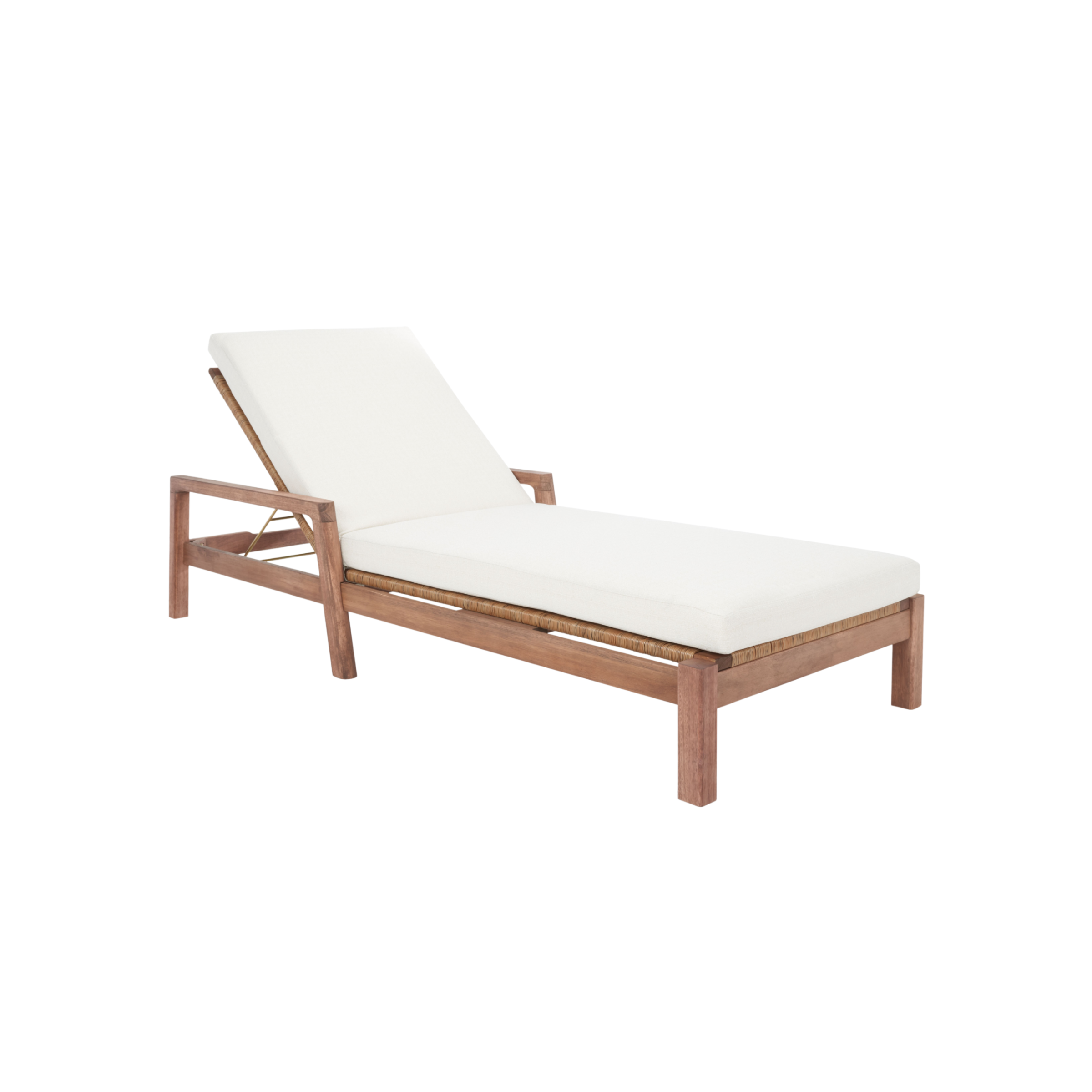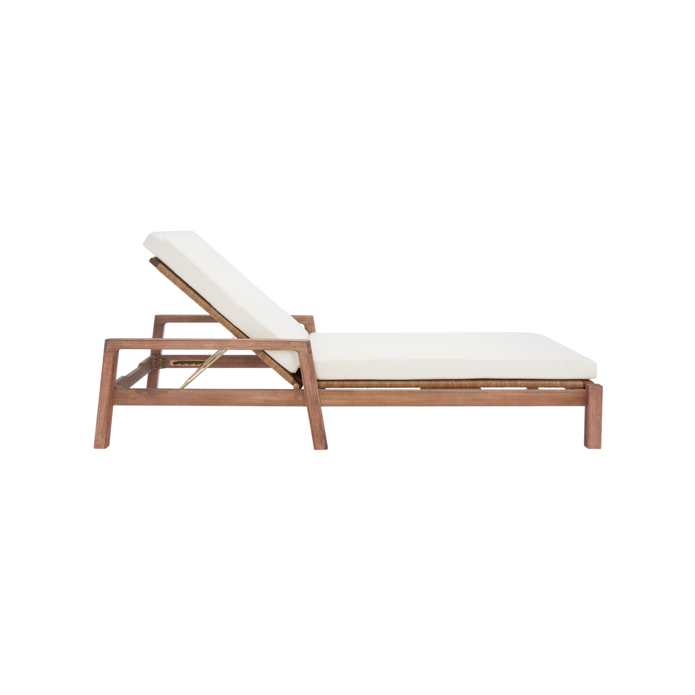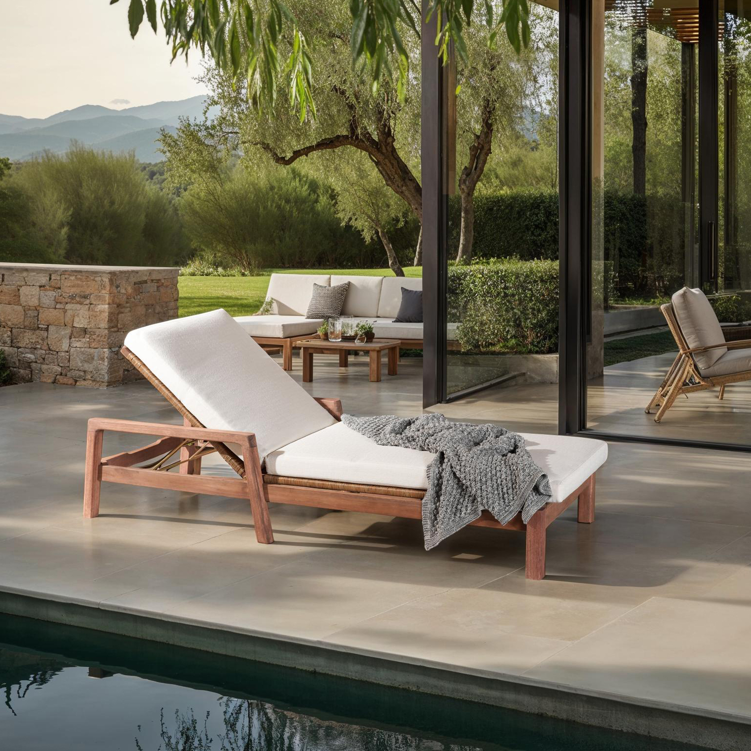 A must-have for the stylish staycation, this White Donnamaria Sun Lounger epitomizes outdoor comfort. Plush white linen cushions offer lavish relaxation in the sun, while a clean-lined natural eucalyptus frame enhances the aesthetics.